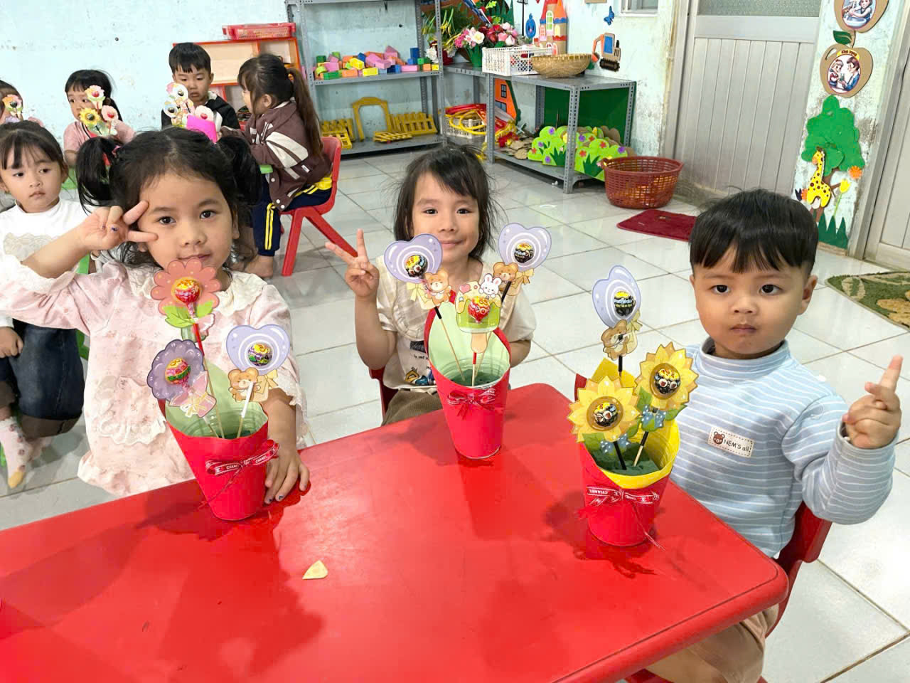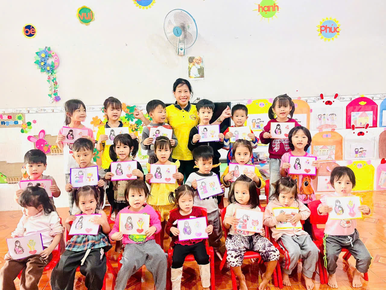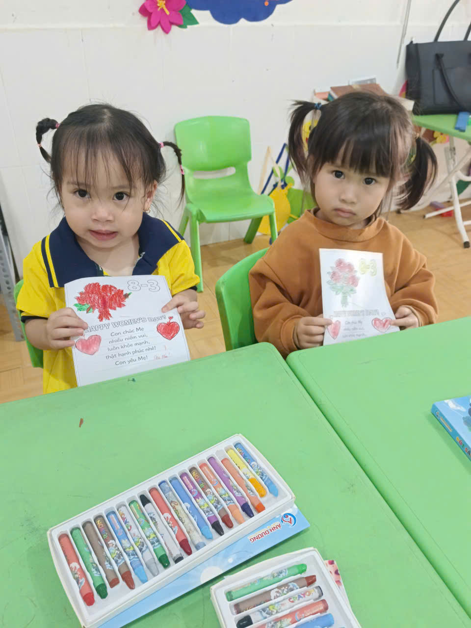 ác bé tại Trường Mầm non Hoa Ban đã tham gia hoạt động làm thiệp tặng mẹ và bà đầy ý nghĩa.